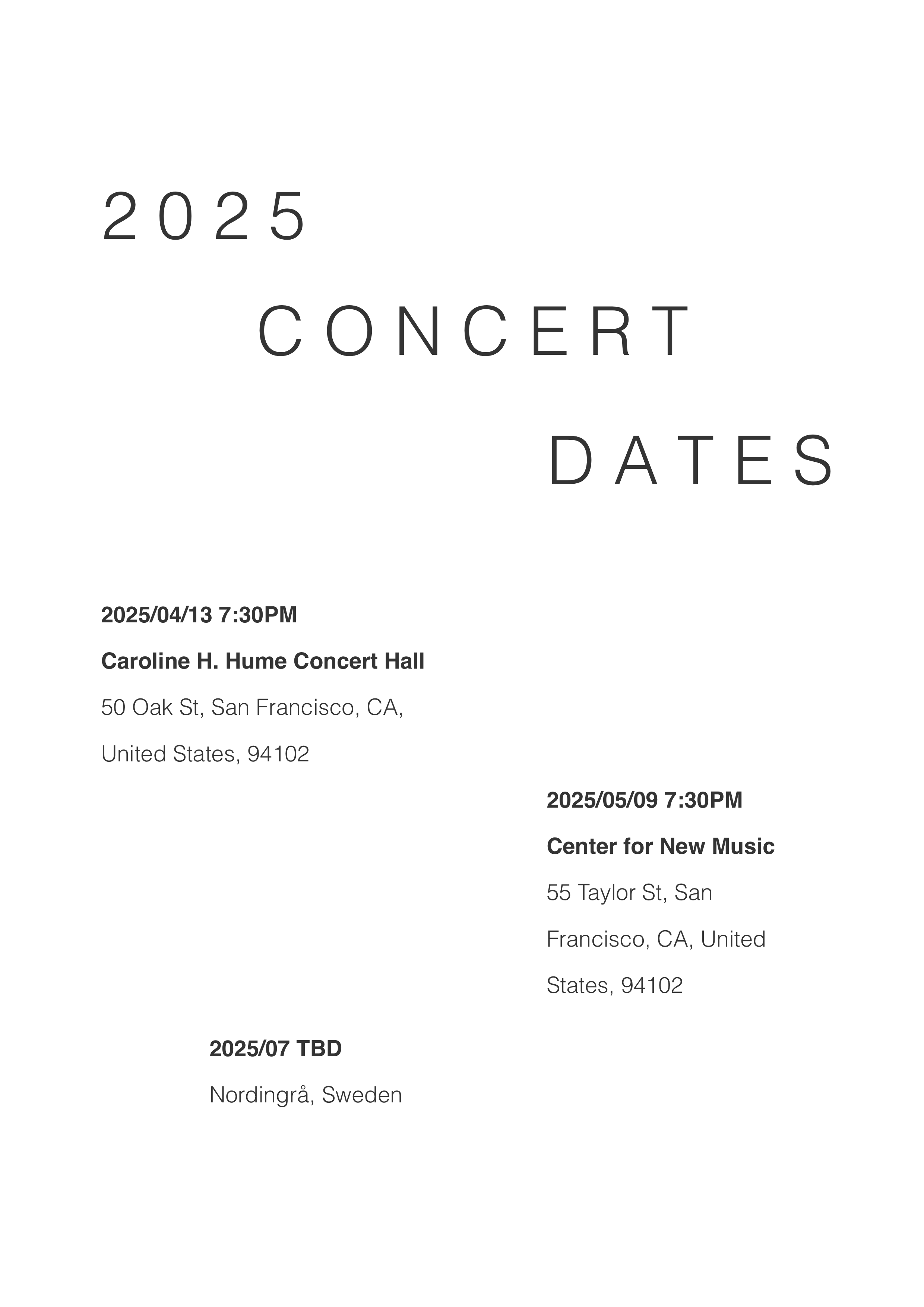 Schedule of concert dates for 2025 with three events listed, including dates, times, venues, and locations in San Francisco, CA, and Nordingrå, Sweden.